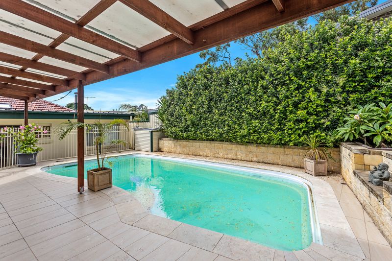 - Glass sliding doors open to a covered alfresco area with a pool