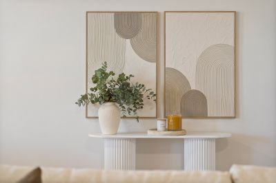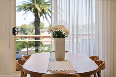 - Open plan living and dining area, enhanced by elegant sheer curtains and a fresh contemporary palette